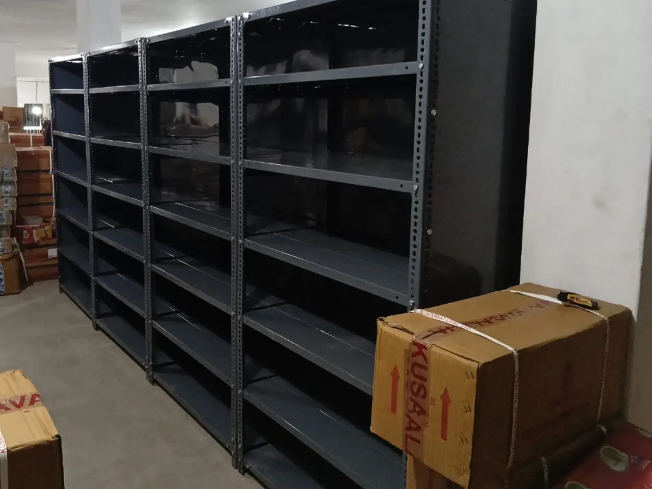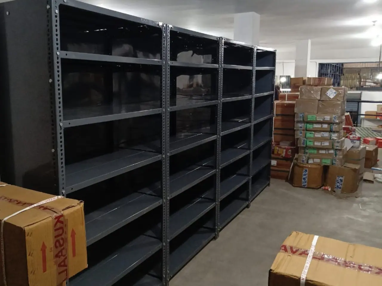 The installation showcases the perfect blend of functionality and aesthetics, ensuring maximum storage capacity while maintaining an organized environment. Built with precision-engineered steel, the slotted angle racks are ideal for accommodating varying load capacities, providing a tailored solution for every storage need.
